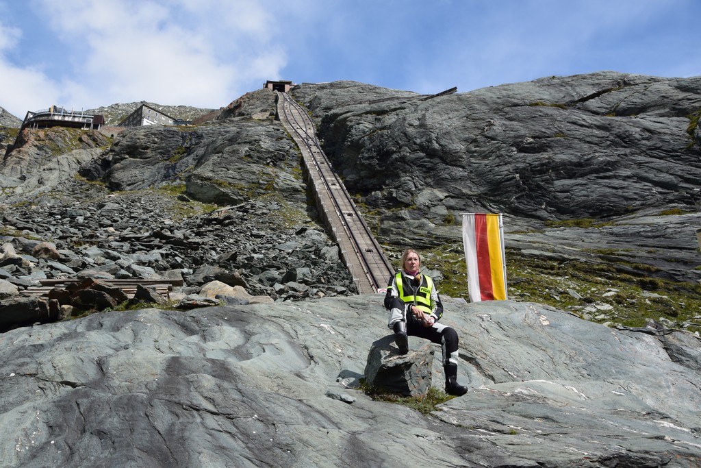 W drodze do dołu odbijamy w kierunku lodowca Pasterz i ponownie zaczynamy wspinaczkę. Na miejscu korzystamy z kolejki szynowej wybudowanej w 1963 roku aby zjechać do olbrzymiego lodowego jęzora Pasterza. Okazuje się, że kolejka tylko zjeżdża do pewnego poziomu a dalej trzeba zrobić sobie trekking. Nie jesteśmy do tego przygotowani ani pod względem ubrania (ciuchy motocyklowe) ani pod względem czasu (jeszcze sporo kilometrów przed nami). Myślę, że nocleg powinniśmy mieć zaplanowany gdzieś na miejscu i na wszystkie atrakcje poświęcić cały dzień a najlepiej dwa dni. Może kiedyś uda się powtórzyć.