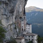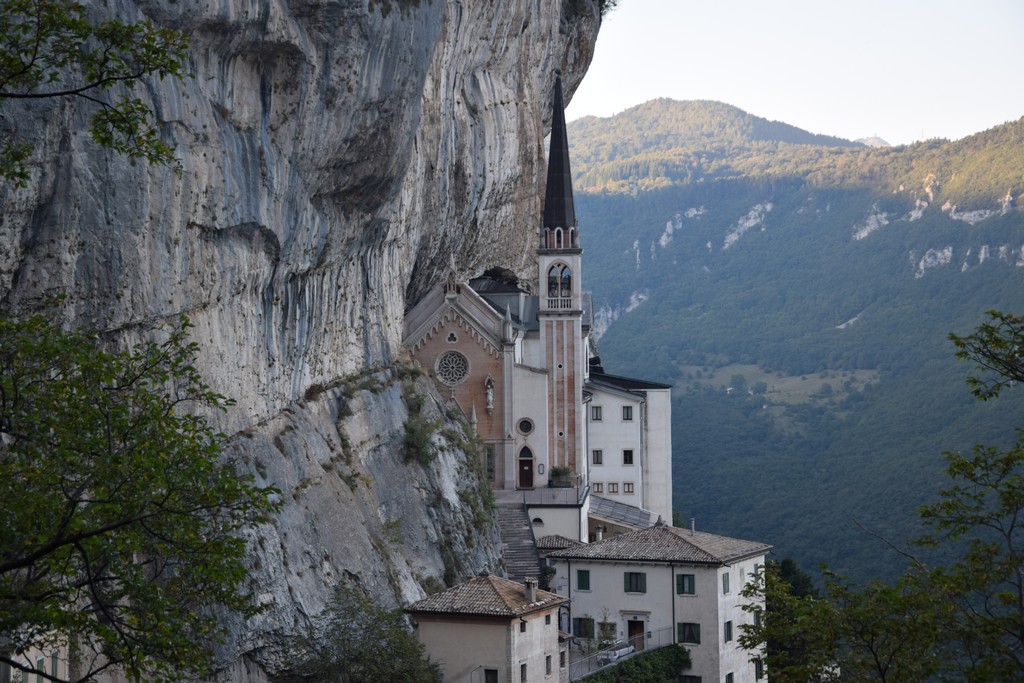 Teraz jedziemy w kierunku Madonna dell Corona wjeżdżając ponownie w góry. Niestety dojazd do tego sanktuarium jest fatalnie oznaczony. Nawigacja prowadzi nas stromą, bardzo wąską uliczką w dół. W pewnym momencie znak zakazu ruchu. Zastanawiamy się co robić. Spotkani Polacy mówią, że przed chwilą samochodem też dojechali do tego miejsca, wycofali się i zostawili samochód na górze. Ja jednak jestem za bardzo leniwy. „Upycham” więc skutiego przy krawędzi drogi. Trochę się o niego obawiam bo jest tutaj naprawdę wąsko i stromo a z prawej strony urwisko. Po powrocie okaże się, że skuti miał towarzystwo w postaci innego motocykla, który w podobny sposób zaparkował.