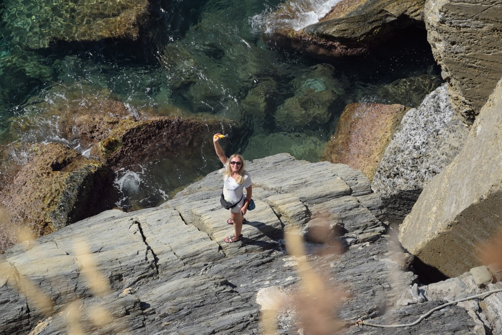 Udajemy się w kierunku plaży a tak naprawdę w kierunku skalistego klifu na którym położona jest Manarola. Na miejscu widzimy, że pomimo braku typowej plaży, chętnych do opalania nie brakuje. Podziwiamy jak niektórzy z bardzo wysokich skałek skaczą do krystalicznie czystej wody. Barwa morza w tym miejscu nas zachwyca. Bardzo żałujemy, że nie zabraliśmy ze sobą strojów kąpielowych szczególnie, że jest bardzo gorąco.
