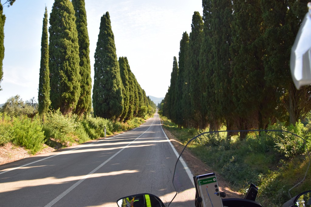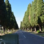 Po kilku kilometrach dojeżdżamy do Viale dei Cipressi (Aleja Cyprysów) tak charakterystycznej dla Toskanii. Początki tej drogi sięgają XIX wieku a obecnie po obu jej stronach rośnie około 2400 cyprysów. Prowadzi ona w linii prostej, po niewielkich pagórkach, do malutkiego Bolgheri. Jest cudownie. Właśnie dla takich widoków tutaj przyjechaliśmy.
