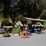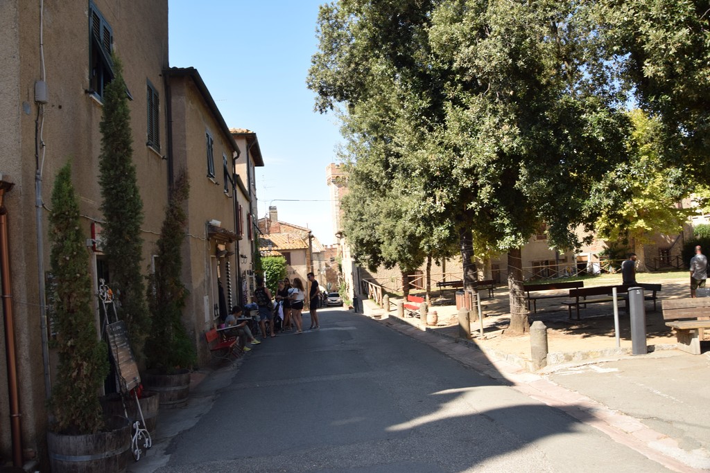 Samo Bolgheri to chyba najmniejsze miasteczko jakie odwiedziliśmy na naszej trasie. Znajduje się ono jak większość takich miasteczek na wzgórzu. Parking usytuowany jest poza murami u podnóża góry. Mi z lenistwa nie chce się iść pod górę, więc próbujemy poszukać miejsca dla skutiego na terenie miasteczka. Pierwsza próba kończy się niepowodzeniem. Robimy więc drugie podejście i parkujemy nasz pojazd wzdłuż jednej z uliczek gdzie przy małym placyku siadamy na kawę i coś słodkiego. To kolejny plus dla dwóch kółek 🙂
