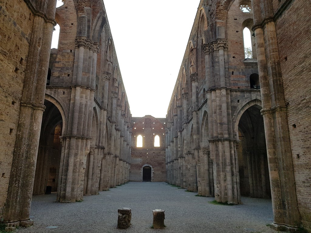 Zaczyna robić się późno a na dzisiaj pozostało jeszcze Opactwo San Galgano. Na miejsce docieramy na 30 minut przed zamknięciem. Dodatkowo okazuje się, że wbrew temu co pokazuje nawigacja, do samego opactwa nie da się dojechać (zakaz ruchu). Ostatnie 600 metrów z parkingu pokonujemy szybkim marszem aby zdążyć przed zamknięciem.