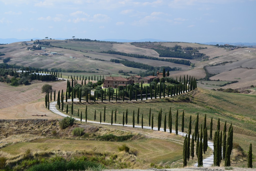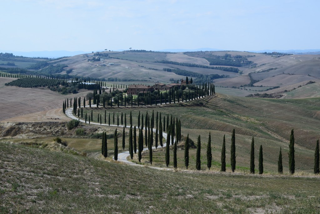 Jedziemy dalej oglądać cyprysy 🙂 Pierwszy punkt widokowy to kręta droga obsadzona cyprysami, która prowadzi do agroturystyki Baccoleno. Droga znajduje się na terenie prywatnym a wjazd na nią blokuje zamknięta brama. Jednak tuż obok bramy jest wydeptana przez miłośników tego wspaniałego widoku ścieżka, która prowadzi na wzgórek z którego widać w całej okazałości samą agroturystykę jak i prowadzącą do niej drogę.