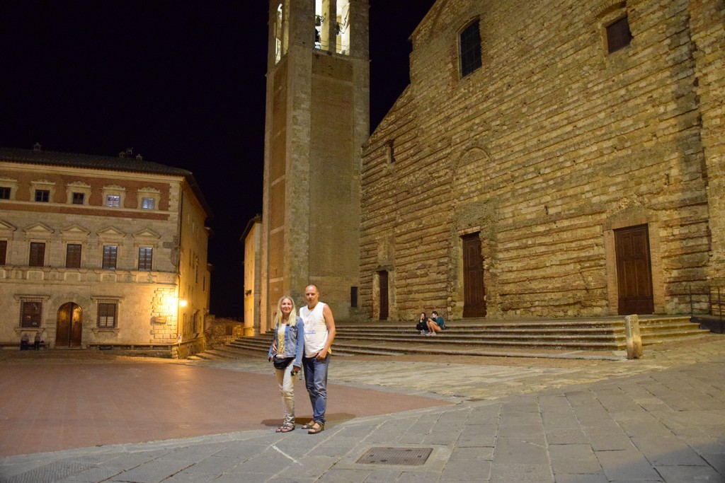 Na dzień dzisiejszy mamy w planie jeszcze Montepulciano do którego dojeżdżamy gdy słońce zaczyna chylić się ku zachodowi. W tym miasteczku również toczyła się akcja filmu „Pod słońcem Toskanii”. Szukamy placu na którym odbywał się pokaz z flagami ale słabo nam to idzie. Zrobiło się ciemno a my jesteśmy zmęczeni i głodni. Znajdujemy więc miłą knajpkę w której się regenerujemy. W drodze powrotnej do skutiego, trochę przypadkiem trafiamy na plac w centrum, którego wcześniej bezskutecznie szukaliśmy. Okazało się, że trochę zmyliły nas znaki i wcześniej skręciliśmy w złą uliczkę.