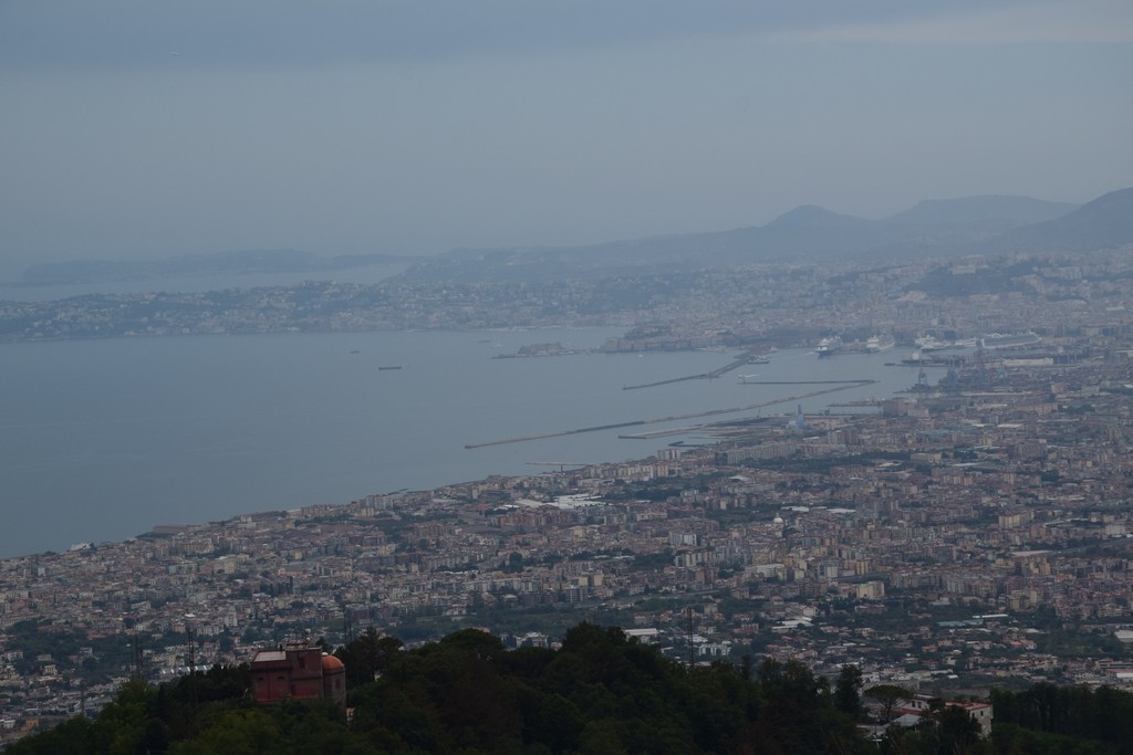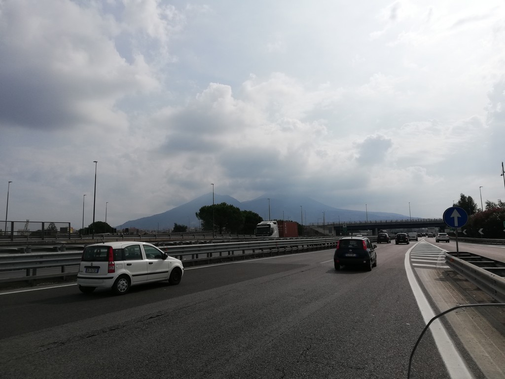 Plan na dzisiaj to Wezuwiusz i Pompeje. Od rana widać, że zbiera się na deszcz. Wezuwiusz widziany z Neapolu przykryty jest chmurami.