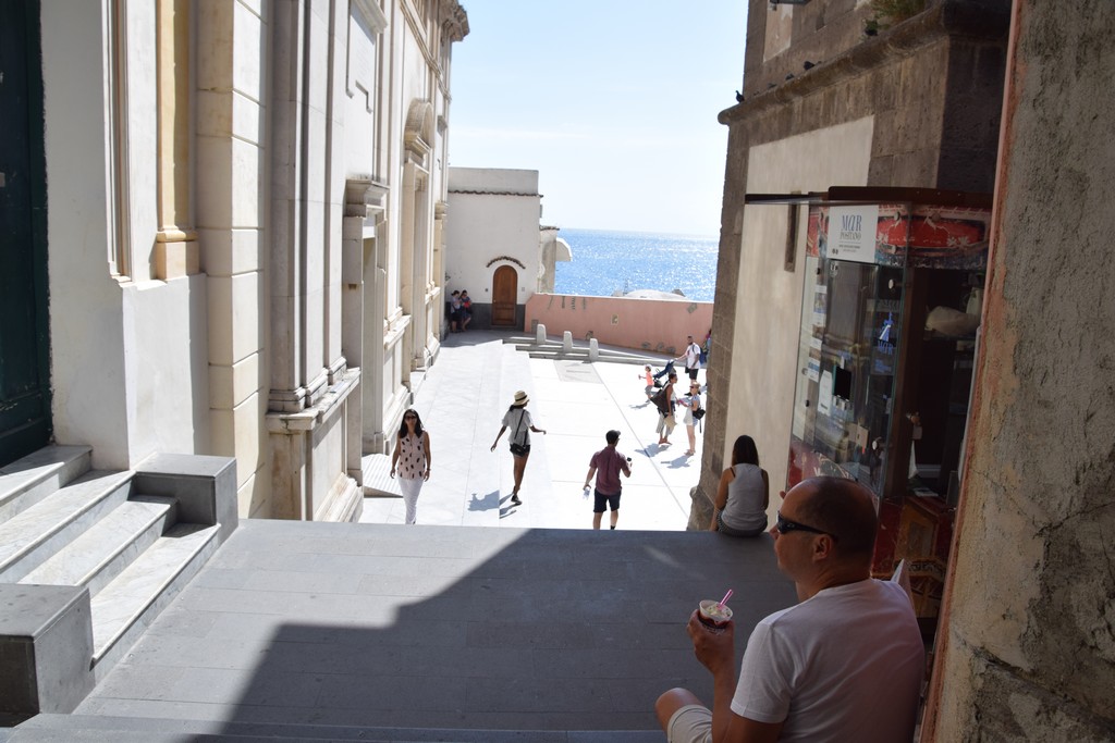 Do plaży na którą się udajemy prowadzi baaaardzo dużo schodów. Po drodze spotykamy osoby z dużymi walizkami, które ciągną po stromych uliczkach i niosą po niezliczonej ilości schodów. Zapewne udają się do jednego z licznych apartamentów/hoteli. Z jednej strony zazdroszczę takiej lokalizacji na odpoczynek bo jest tu pięknie. Z drugiej zaś strony współczuję konieczności taszczenia tych bagaży.