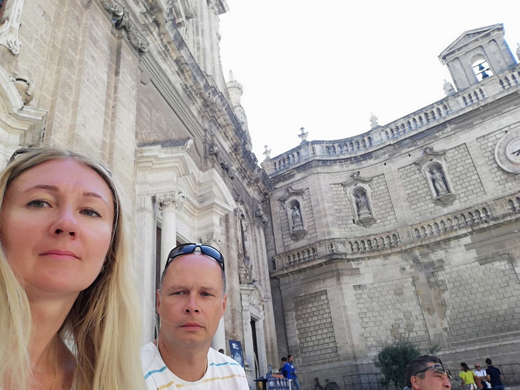 Przed wyjazdem do Monopoli, sprawdziliśmy w Internecie, że w katedrze msza jest o 10.00. Na miejscu okazuje się jednak, że takowej nie ma. Nie bardzo możemy znaleźć informacji o godzinach nabożeństw. Udajemy się więc na poszukiwanie innego kościoła. Wydawać by się mogło, że we Włoszech gdzie kościołów jest mnóstwo nie powinno być z tym problemu, jednak nic bardziej mylnego. W końcu się udaje.