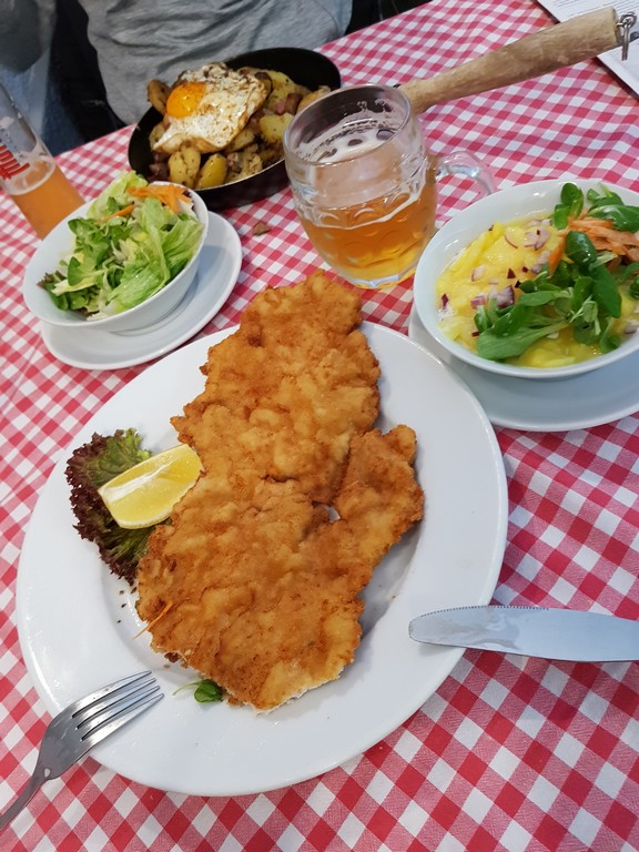 Po pozbyciu się bagażu podjeżdżamy kawałek na Naschmarkt – mieści się tu ponad 120 stoisk i lokali gastronomicznych. Wybór jedzenia jest ogromny i trudno się na coś zdecydować. Mimo tak dużej liczny lokali, większość stolików jest zajęta. W końcu udaje nam się znaleźć wolny. Ja tradycyjnie biorę Wiener Schnitzel, żona zaś lokalny przysmak podawany na patelni. Jedzenie bardzo smaczne i w miarę tanie.