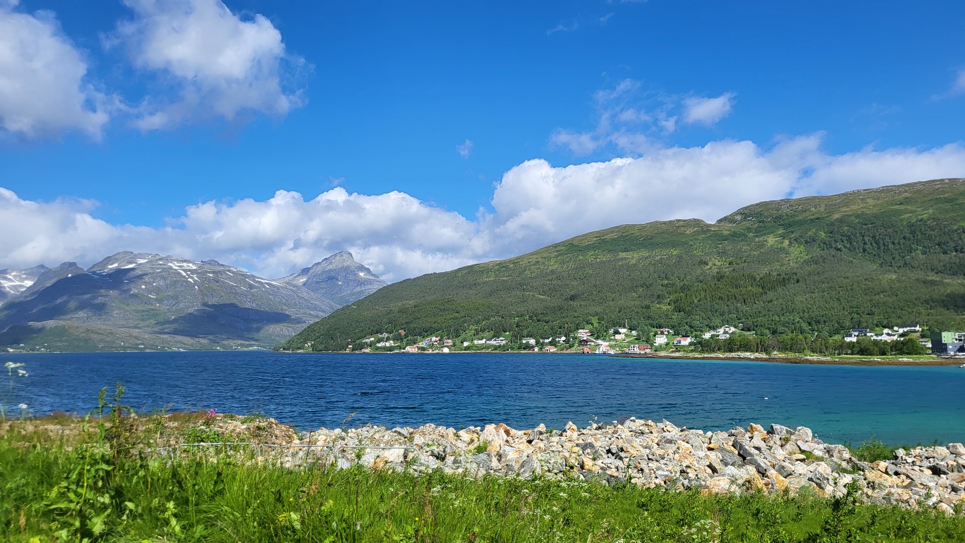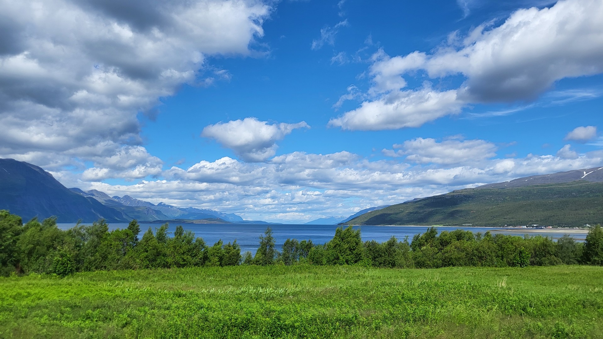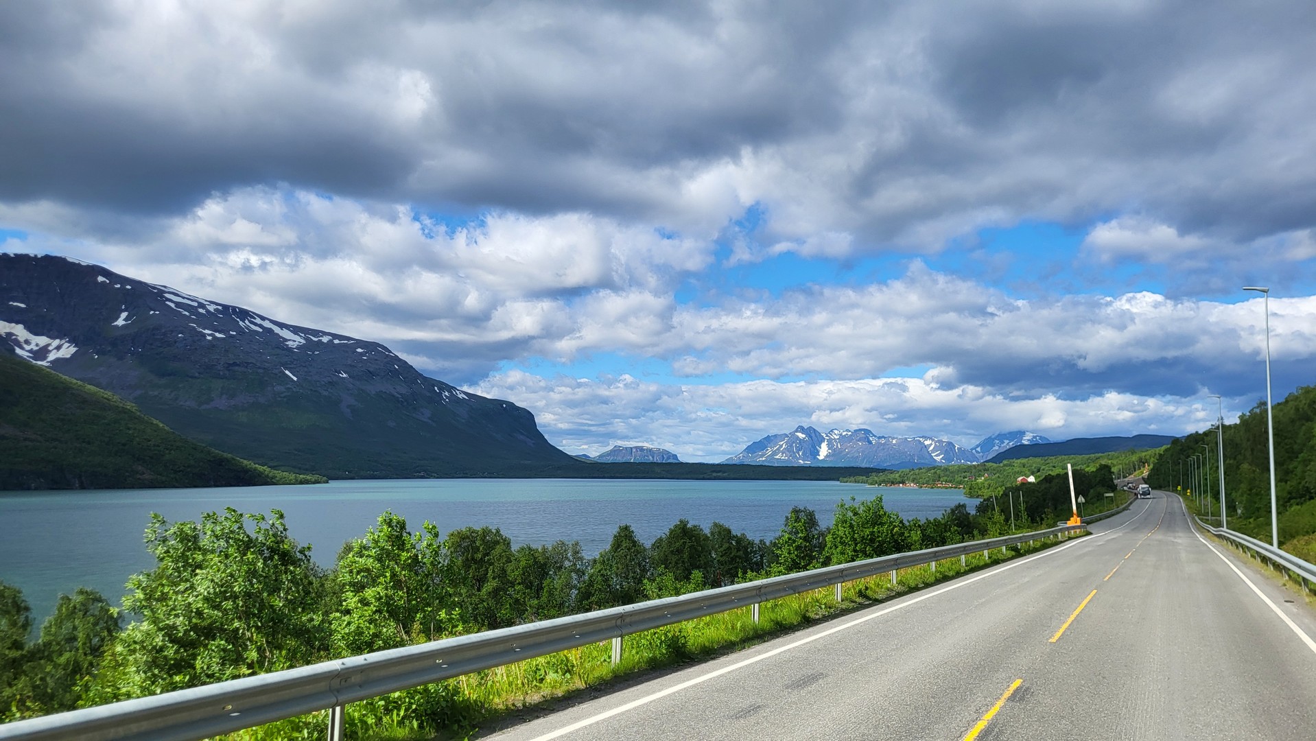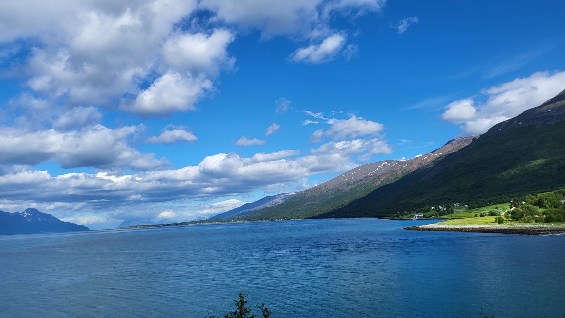 Dziś w planie Tromsø do którego mamy około 4 godzin jazdy. Droga prowadzi wzdłuż fiordu, więc możemy napawać się pięknymi widokami. Gdy świeci słońce, jest całkiem przyjemnie, ale gdy tylko chowa się za chmury, temperatura spada do 12 stopni, a wtedy robi się przejmująco zimno. Do tego ponownie dokucza nam mocny wiatr.