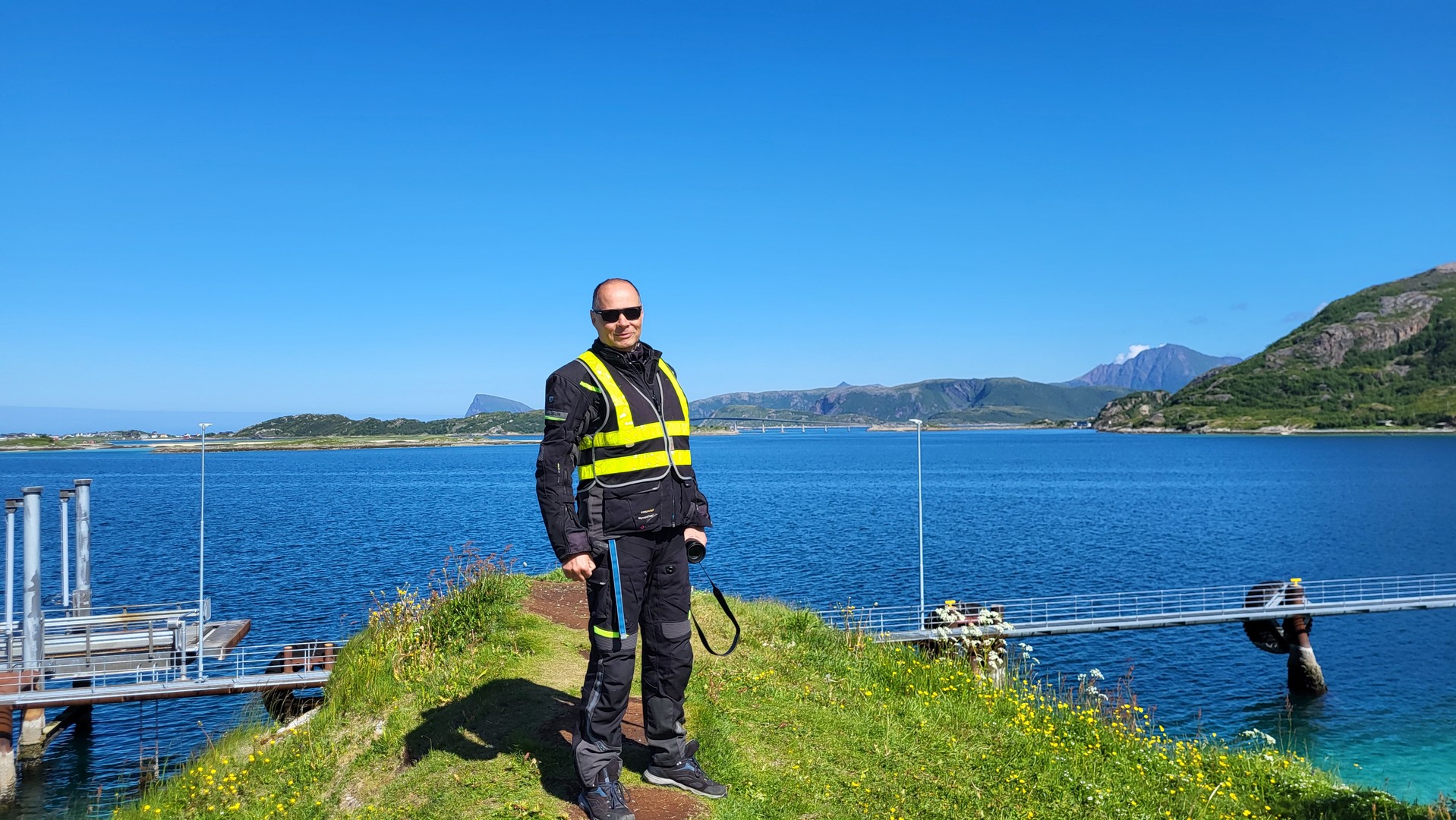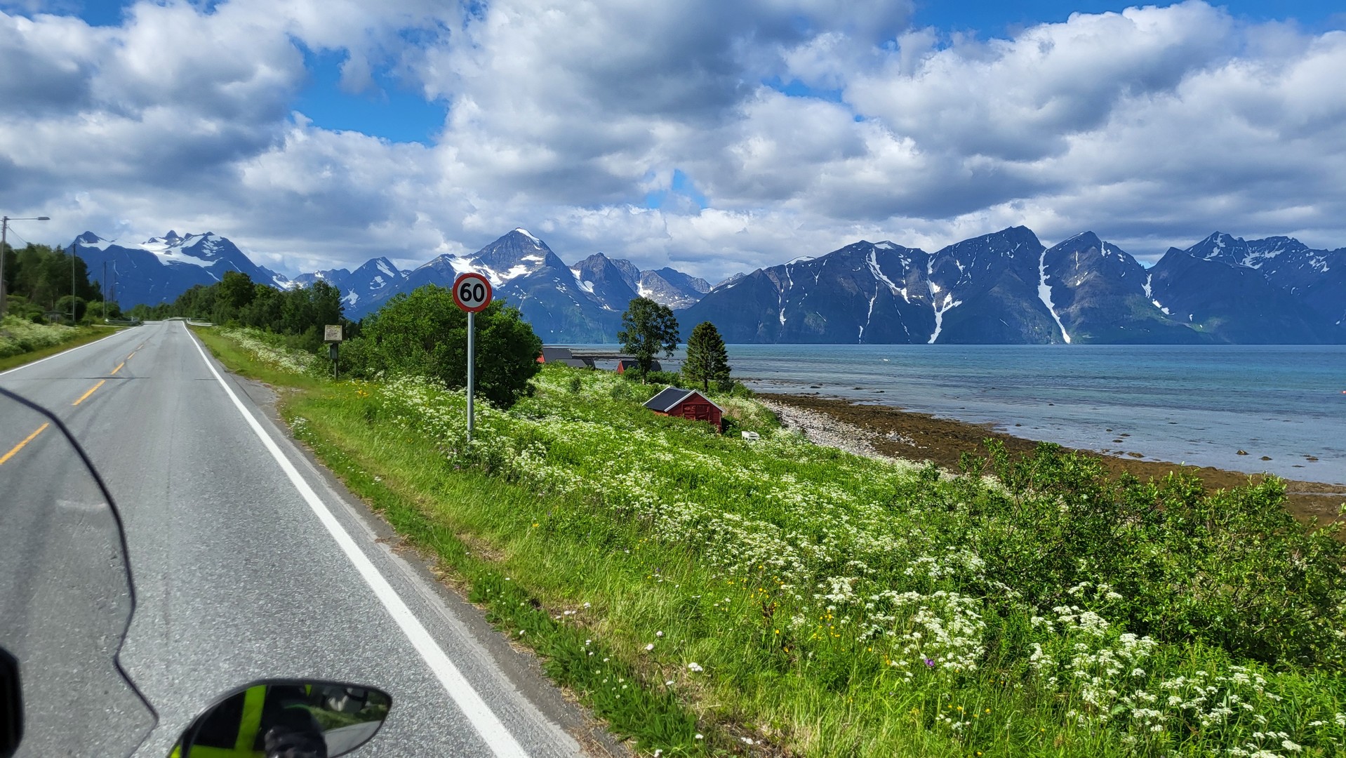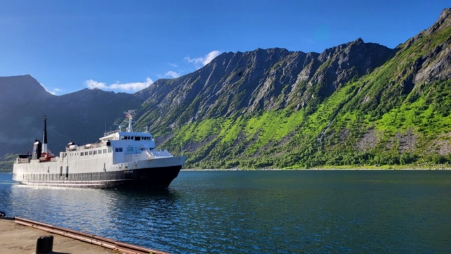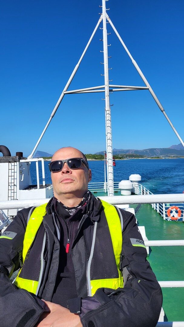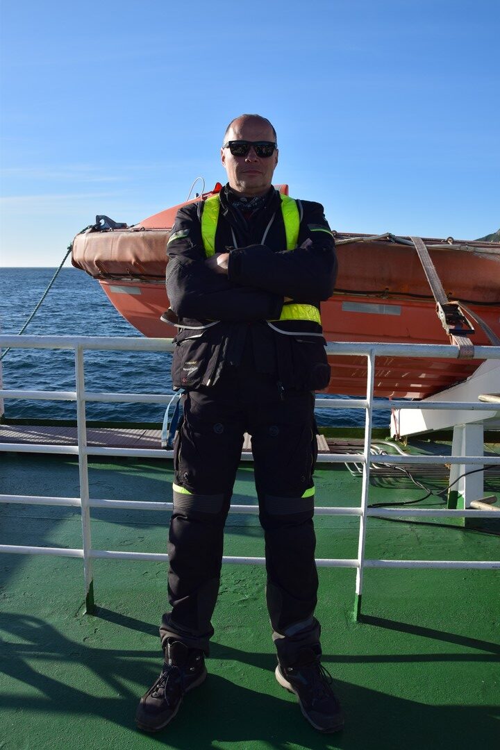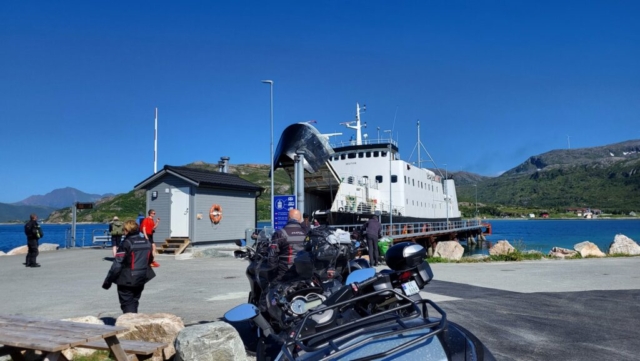 Na początek mamy krótki odcinek do promu na wyspę Senja. Po dojechaniu na miejsce ustawiamy się w kolejce za samochodami nie wiedząc czy przejazd motocykla na początek nie będzie naruszeniem jakichś lokalnych zasad. Postanawiamy sprawdzić, co dzieje się na początku kolejki. Okazuje się, że motocykle mają jakby oddzielną kolejkę. Na promie ustawiane są po bokach, tam gdzie nie parkują samochody.