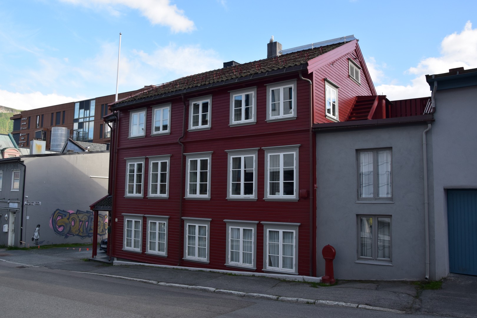 Kierujemy się dalej główną ulicą miasta – Storgata. Aktualnie trwa jej remont, ale już widać, że po zakończeniu prac będzie prezentować się świetnie. W tej części Tromsø znajdują się najstarsze drewniane domy, głównie z XIX wieku. Muszę jednak przyznać, że czuję się rozczarowany. Może to kwestia oczekiwań – z opisów wyobrażałem sobie coś na wzór Bergen, a tymczasem drewniane domy są tu raczej pojedynczymi reliktami przeszłości, wciśniętymi pomiędzy nowoczesne budynki, które zupełnie nie pasują do historycznego klimatu. Takie jakieś to wszystko …