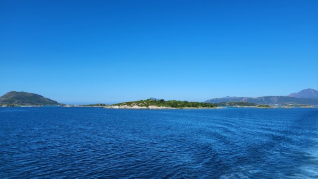Prom o 19-tej jest ostatnim tego dnia, więc na wszelki wypadek stawiamy się pół godziny wcześniej. Kolejka kamperów i samochodów jest ogromna. Z wcześniejszych obserwacji wiemy jednak, że jako motocykliści możemy ominąć tę kolejkę i ustawić się na początku – to nasz mały przywilej 🙂 Na promie motocykle znów ładowane są po bokach. Sprawnie zajmujemy wskazane miejsce i odpływamy.