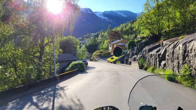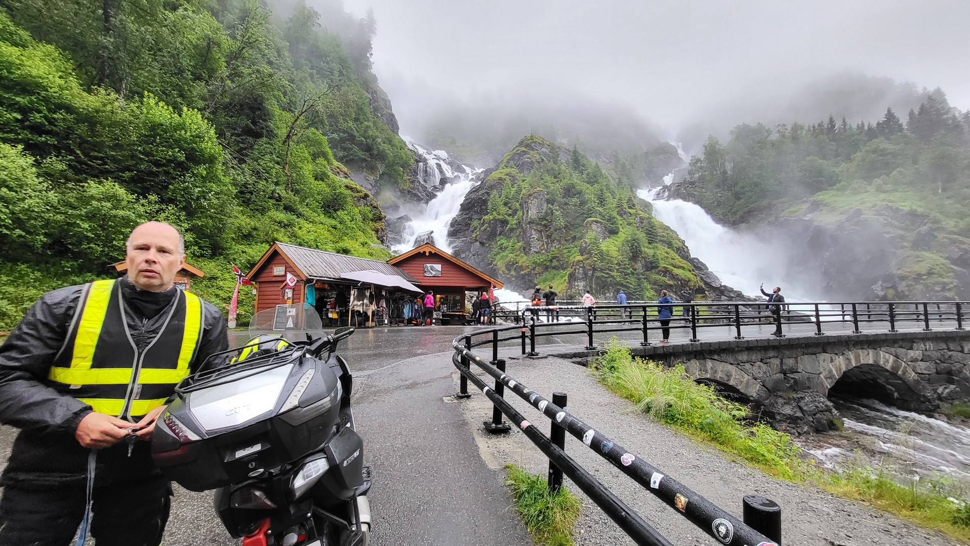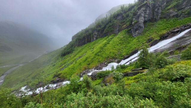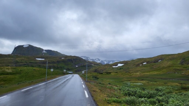 Dzisiejszy plan był prosty – przejazd do kolejnego noclegu z jedną atrakcją niemal na końcu trasy. Jednak los (a raczej nawigacja) zafundował nam niespodziankę. Zupełnie nieświadomie wjechaliśmy w wysokie góry i trafiliśmy na zapierające dech w piersiach widoki. Droga nr 13, którą podążamy za miejscowością Røysane, zaczyna ostro wspinać się ku górze. Asfalt świetnej jakości, mnóstwo zakrętów – normalnie bajka dla motocyklisty. Niestety – właśnie tu dopada nas kulminacja deszczu. Jazda w strugach wody odbiera całą radość z tej trasy 🙁