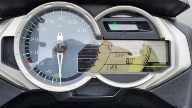 Rękawice mam kompletnie przemoczone, podobnie jak… 4 litery. Gdy siedzę na skutim to pode mną tworzy się w kanapie dołek, więc woda spływająca z kurtki, tworzy kałużę w której siedzę. Po dłuższym czasie membrana w spodniach nie daje rady i woda przez nią przesiąka. Buty mam również totalnie przemoczone – chyba pora kupić sobie typowo motocyklowe.