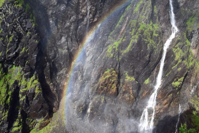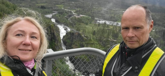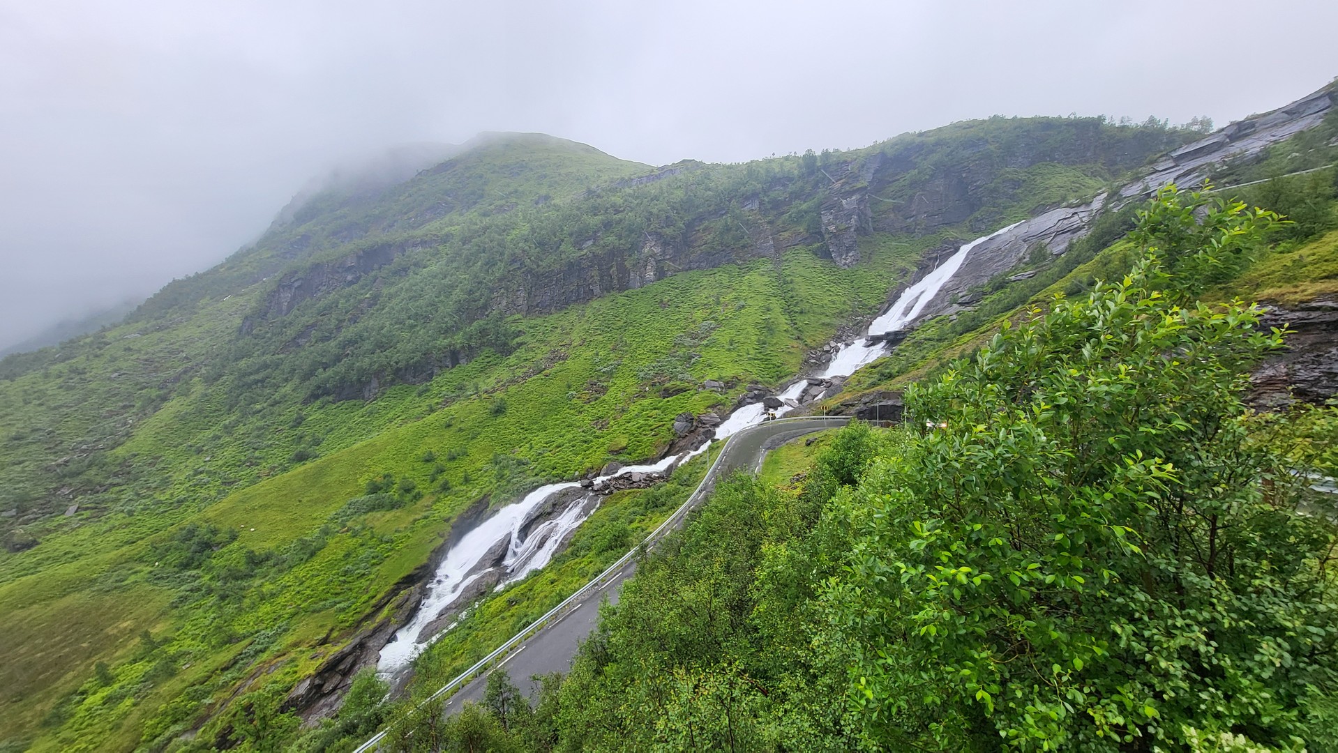 Kierujemy się dalej w stronę wodospadu Vøringfossen. Po drodze krótki postój przy innym wodospadzie – Tvindefossen. Mimo kiepskiej pogody, trasa obfituje w atrakcje. Przejeżdżamy wiszący most, który kończy się tunelem z rondem w środku ; Ostatnie kilometry przed Vøringfossen też są ciekawe – droga ostro pnie się w górę i biegnie przez „zakręcone” tunele, które same w sobie są atrakcją.