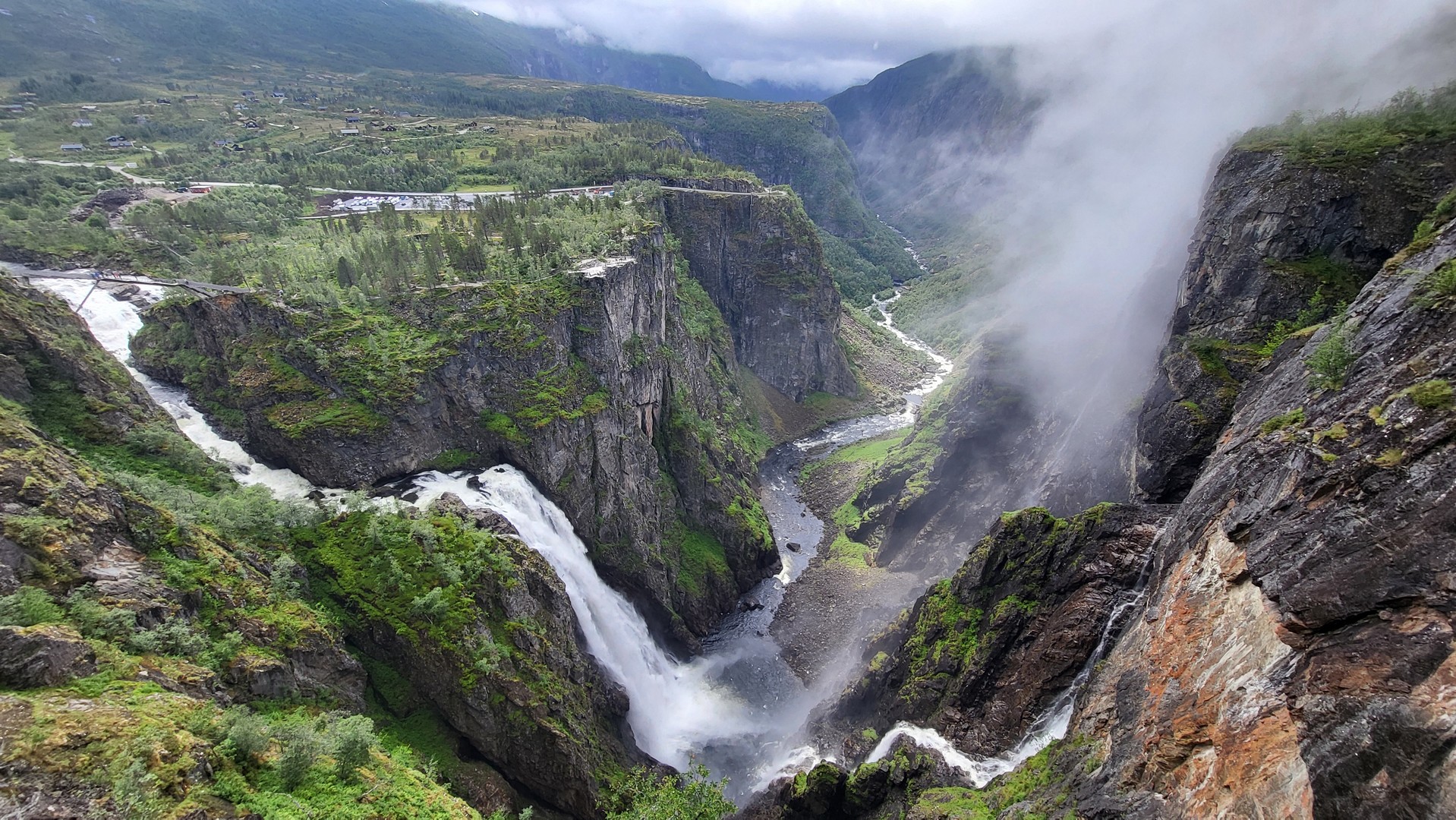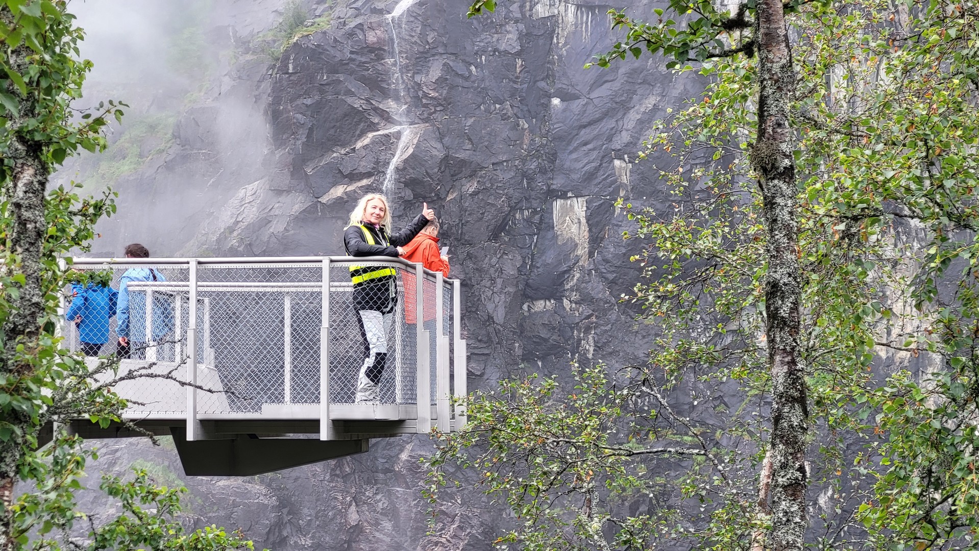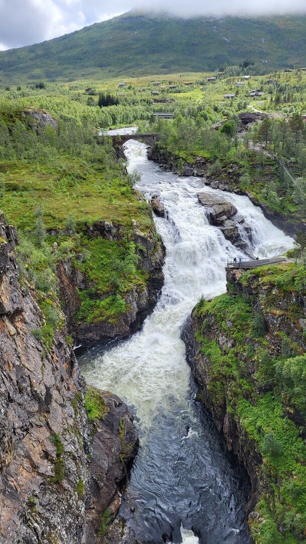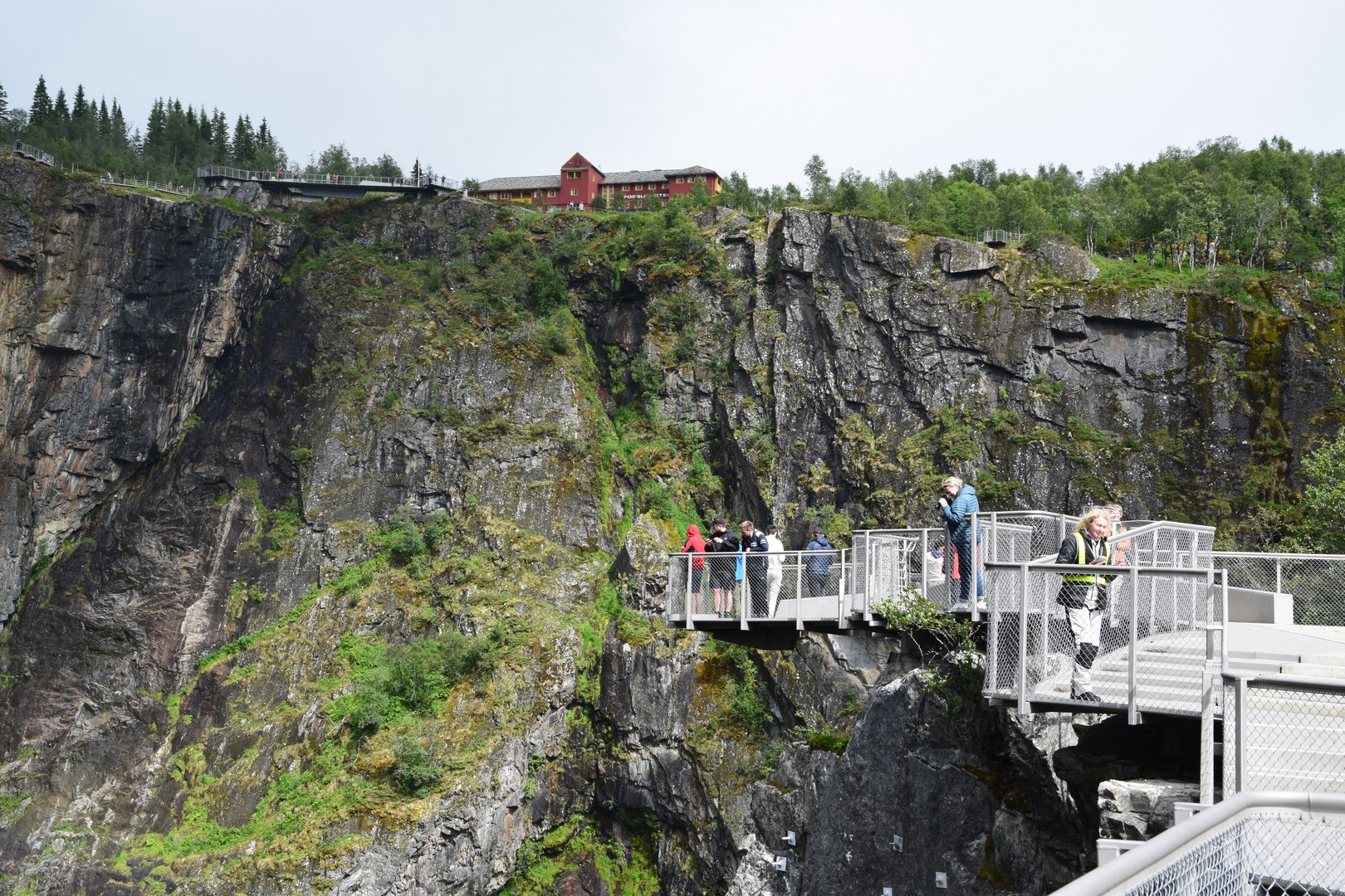Sam wodospad – choć „dopiero” na 83 pozycji pod względem wysokości w Norwegii – robi na mnie ogromne wrażenie. Spada z wysokości 182 metrów i naprawdę jest co podziwiać. Można podejść od dołu, szlakiem, lub zobaczyć go z góry – od strony Hotelu Fossli, który działa tutaj od 1891 roku. My wybieramy widok z góry. Dla turystów przygotowano mnóstwo tarasów widokowych oraz 47-metrową metalową kładkę, która łączy oba brzegi rzeki Bjoreio.