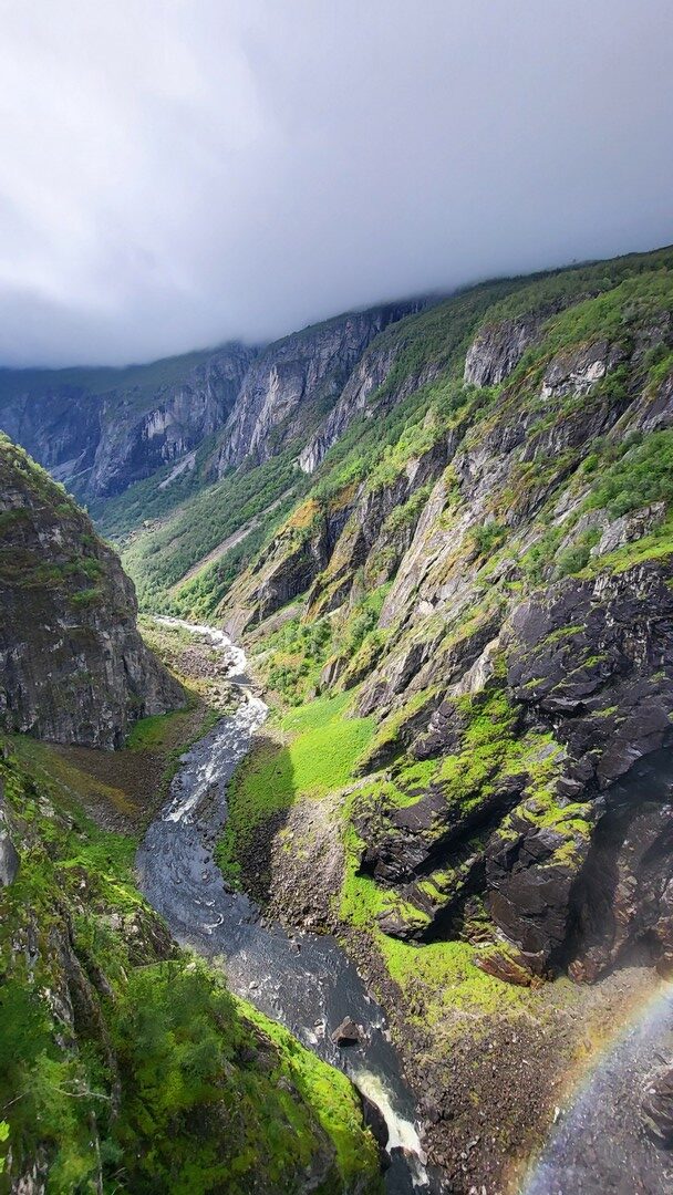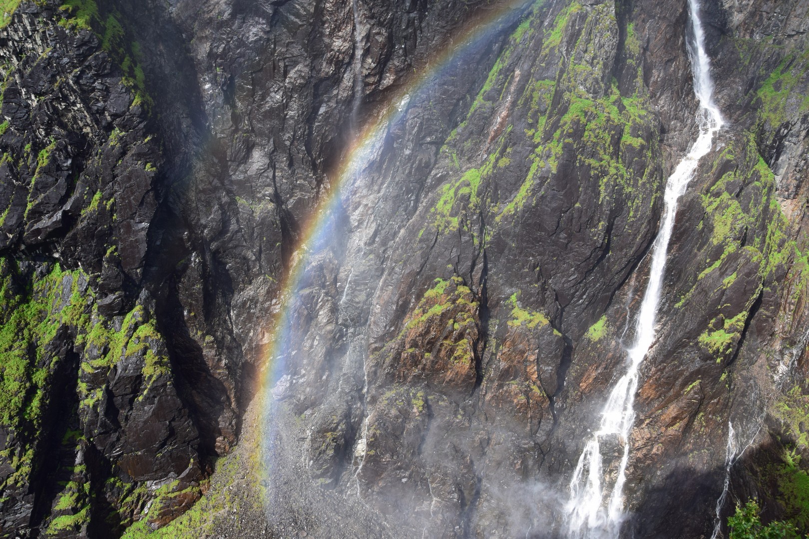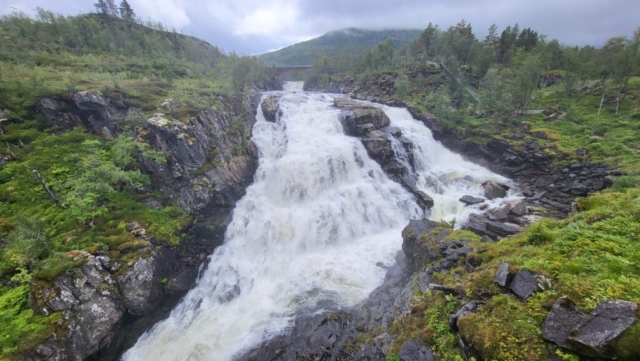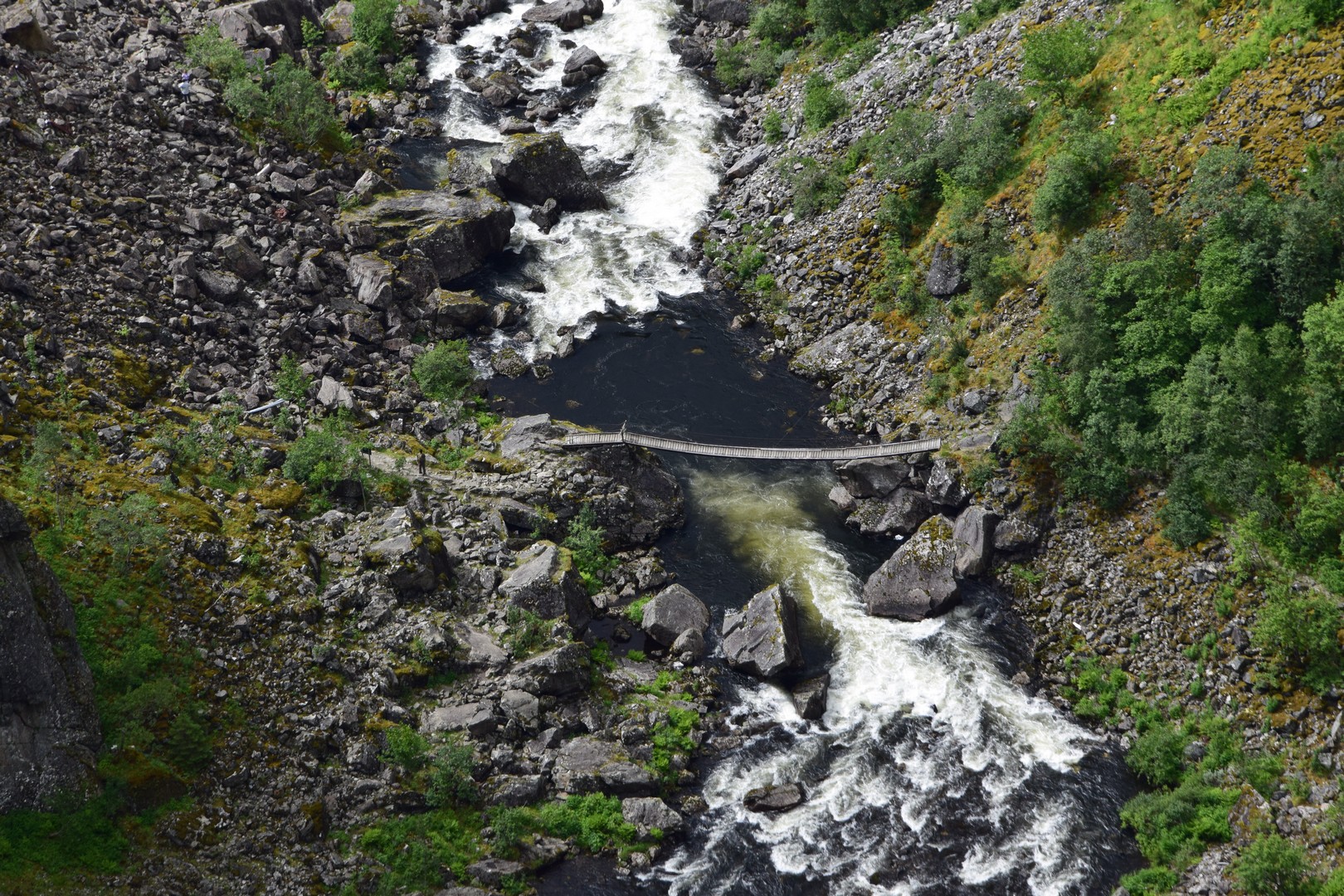 Sam wodospad – choć „dopiero” na 83 pozycji pod względem wysokości w Norwegii – robi na mnie ogromne wrażenie. Spada z wysokości 182 metrów i naprawdę jest co podziwiać. Można podejść od dołu, szlakiem, lub zobaczyć go z góry – od strony Hotelu Fossli, który działa tutaj od 1891 roku. My wybieramy widok z góry. Dla turystów przygotowano mnóstwo tarasów widokowych oraz 47-metrową metalową kładkę, która łączy oba brzegi rzeki Bjoreio.