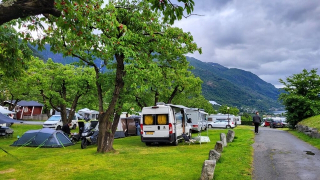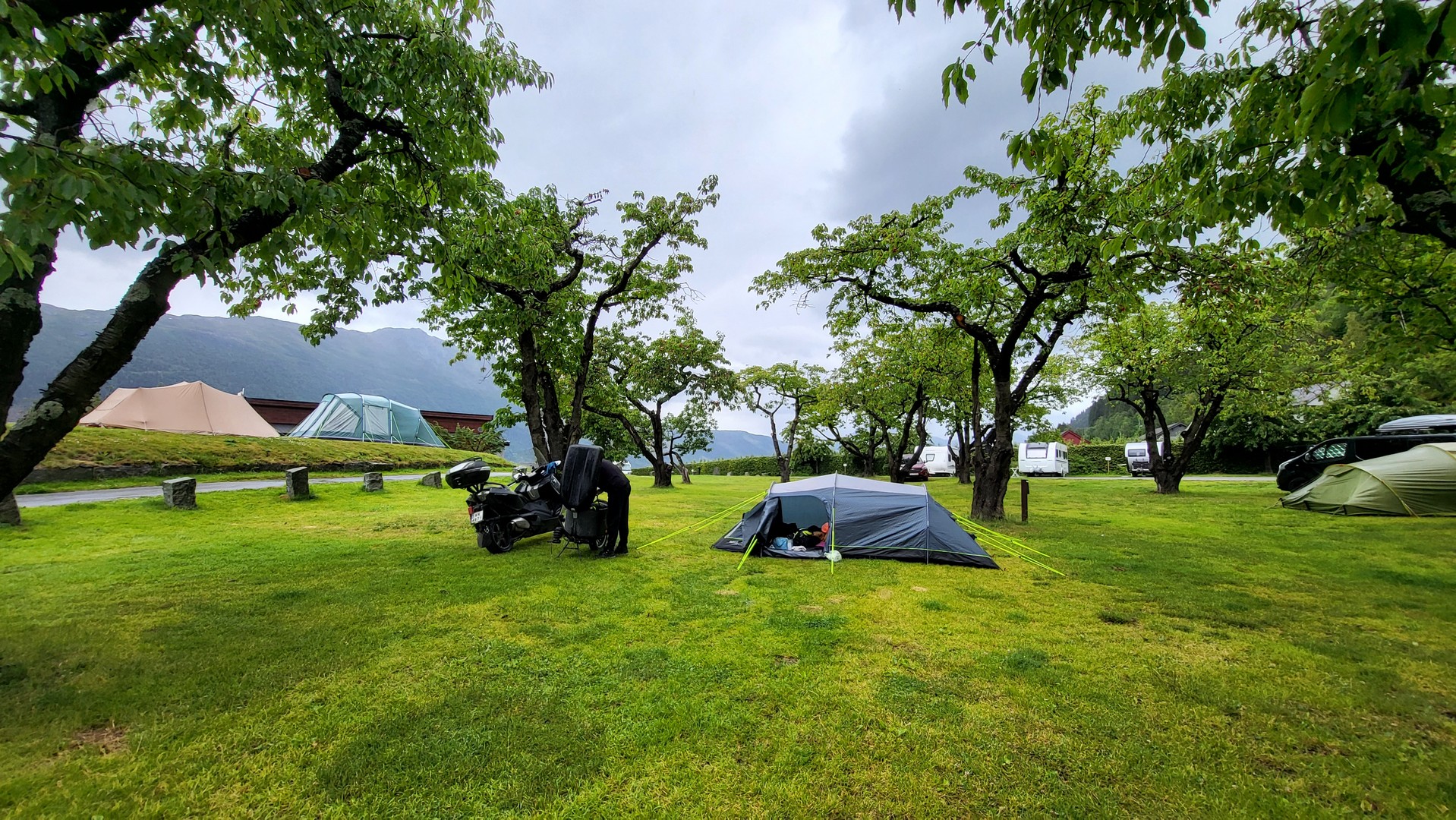 Jutro czeka nas ciężki dzień bo w planie wyprawa na Język Trolla. Chcemy więc zatrzymać się na dwie noce w hyttce. Odwiedziliśmy kilka kempingów w okolicy ale na żadnym nie było wolnej hytki. Na dwóch nawet stały tablice „Brak miejsc”. Czyżby inni również sprawdzili prognozy i planowali Trolltungę na wtorek? W końcu docieramy do pierwotnie zaplanowanego Lofthus Camping i w padającym deszczu rozbijamy namiot.