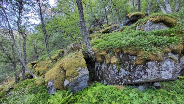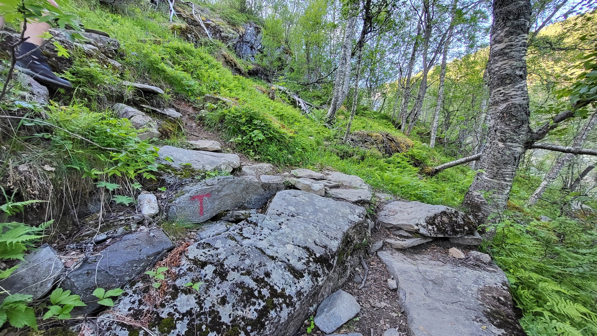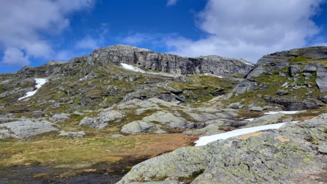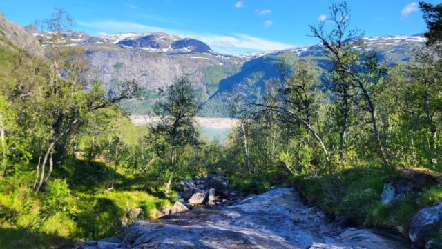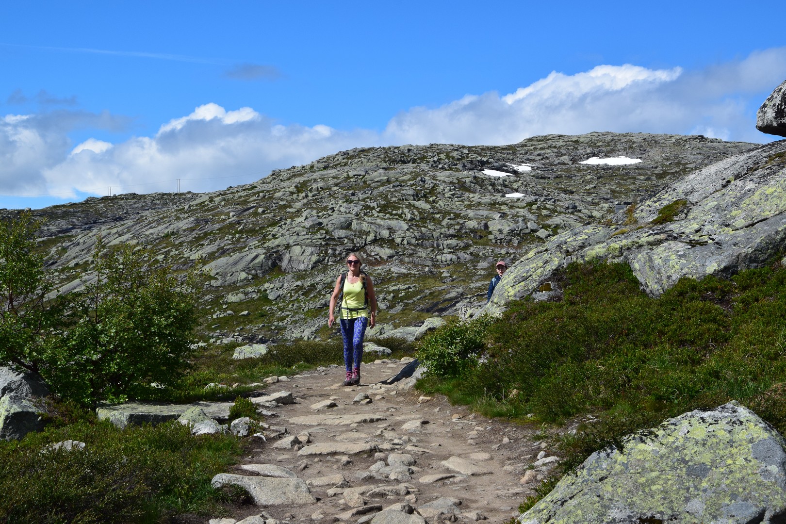 Zaraz po zejściu z głównego szlaku robi się cicho, spokojnie, pusto – niesamowita ulga po tłoku. Do przejścia mamy tylko 700 metrów, ale teren jest wymagający i zajmuje nam to 50 minut. Mimo że z górki, to stary szlak faktycznie trudny. Widać, że Norwegowie go porzucili – kamienie, które kiedyś tworzyły schodki, dziś są zniszcone, zapewne przez warunki atmosferyczne. Ale warto było się pomęczyć – dla tej ciszy, dla tej surowej natury.