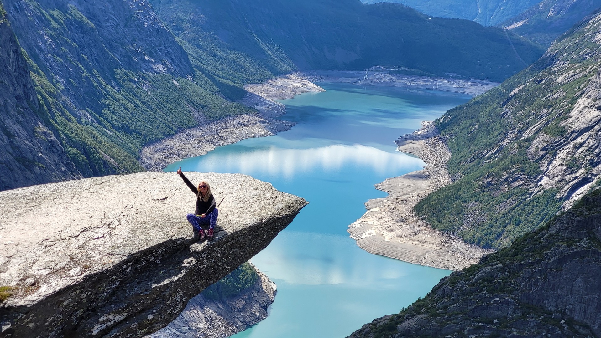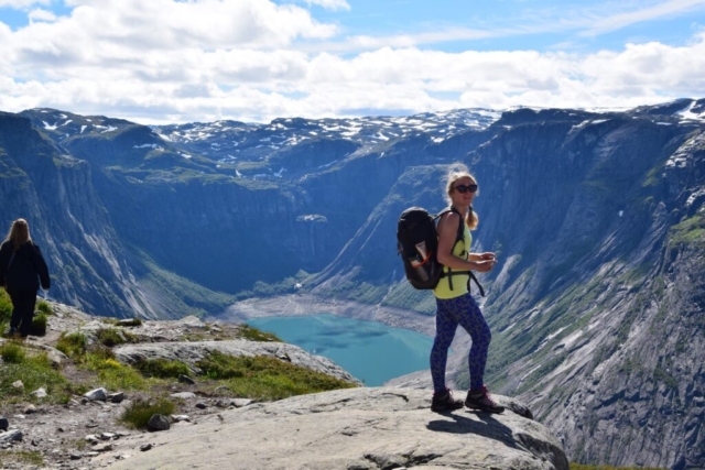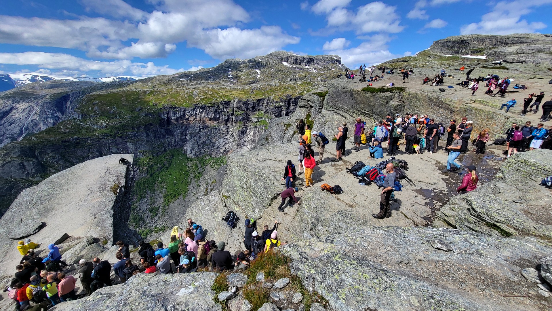 Po 4 godzinach marszu (z kilkoma przerwami) docieramy na miejsce. Uważam to za całkiem dobry wynik, bo mapy.cz mówiły, że powinno nam to zająć 5 godzin. Na miejscu po odczekaniu w kolejce 1,5 godziny (sic!) możemy w końcu wejść na Język Trolla (Trolltunga), czyli bardzo charakterystyczną półkę skalną znajdująca się na płaskowyżu Hardangervidda (około 1100 m n.p.m.). Stąd do tafli jeziora Ringedalsvatnet jest 700 m. Dla mnie to zdecydowanie zbyt duże wyzwanie i na język wchodzi tylko Agata. Ja mam zawroty głowy obserwując z daleka jak ludzie podchodzą i siadają na krawędzi …