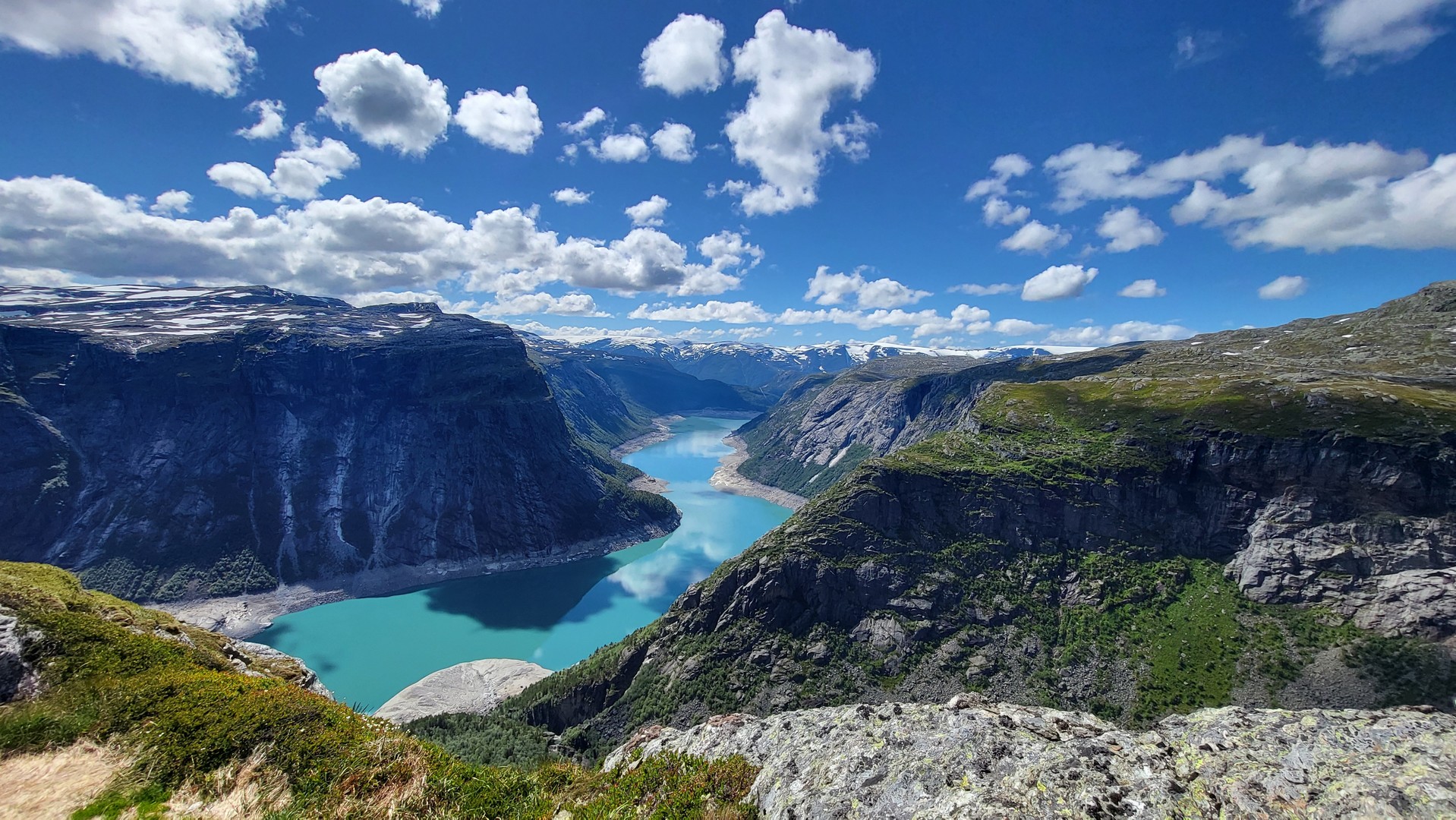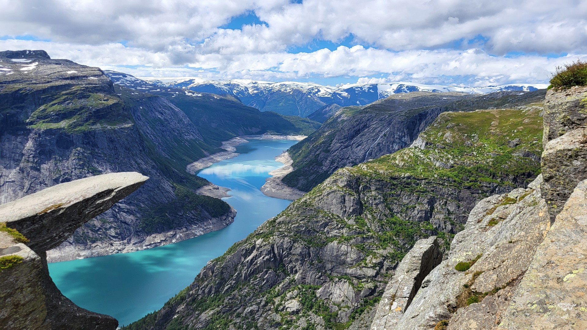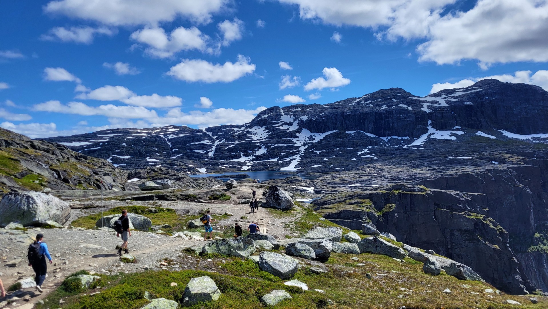 Po 4 godzinach marszu (z kilkoma przerwami) docieramy na miejsce. Uważam to za całkiem dobry wynik, bo mapy.cz mówiły, że powinno nam to zająć 5 godzin. Na miejscu po odczekaniu w kolejce 1,5 godziny (sic!) możemy w końcu wejść na Język Trolla (Trolltunga), czyli bardzo charakterystyczną półkę skalną znajdująca się na płaskowyżu Hardangervidda (około 1100 m n.p.m.). Stąd do tafli jeziora Ringedalsvatnet jest 700 m. Dla mnie to zdecydowanie zbyt duże wyzwanie i na język wchodzi tylko Agata. Ja mam zawroty głowy obserwując z daleka jak ludzie podchodzą i siadają na krawędzi …