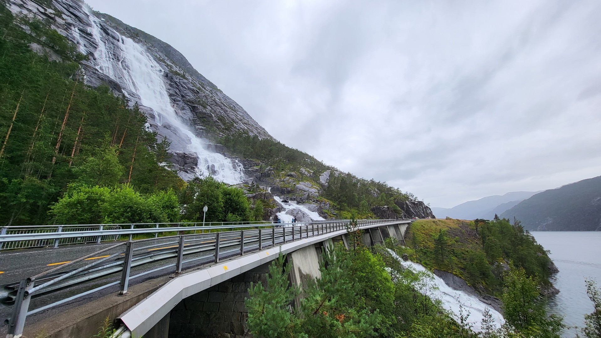Ruszamy w kierunku Stavanger, po drodze planując zahaczyć o wodospad Langfoss – ten ma ponad 600 metrów wysokości co czyni go piątym co do wielkości wodospadem w Norwegii. Zanim jednak tam dotrzemy, niespodziewanie napotykamy Låtefossen (165 m), który mieliśmy już okazję oglądać w 2015 roku. Kilka szybkich fotek i jedziemy dalej.