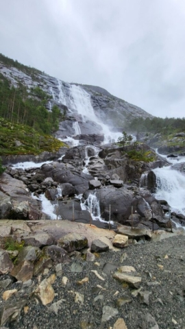Langfoss – choć teoretycznie bardziej okazały – chyba mniej mi się podoba niż Låtefossen. Może to przez pogodę, może przez to, że woda nie spada swobodnie, tylko spływa po skałach. A może po prostu punkt widokowy nie oddaje jego skali, a przez deszcz nie mamy ochoty szukać lepszego.
