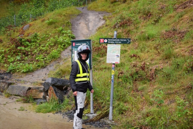 Szybko pozbywamy się ciuchów motocyklowych i ruszamy na szlak. Po chwili okazuje się, że przez te 9 lat wiele się zmieniło. Powstała nowa droga, po której kursują busiki dowożące turystów przez najbardziej stromy odcinek. Koszt tej przyjemności to 150 NOK/os, a według reklamy na dole, jadąc busem oszczędzasz 1,5 godziny i 400 metrów wysokości. Kolejka do busa długa. Pytam o stary szlak, którym szliśmy lata temu. Dowiaduję się, że nadal istnieje, ale zalecają iść drogą, bo szlak jest „trudny”. Doskonale pamiętam jego „uroki” – wryły mi się w pamięć do dziś. Finalnie decydujemy się na busa – lenistwo wygrało 😉 Po 45 minutach udaje się wsiąść. Bus dowozi nas niemal w miejsce, gdzie 9 lat temu musieliśmy zawrócić – wtedy rwący strumień uniemożliwił dalszą wędrówkę. Dziś nad strumieniem wisi solidny mostek. Widać, że cała trasa jest dziś o wiele bardziej dostępna i nastawiona na masową turystykę. Nie to, żebym się uważał za jakiegoś trapera, ale aktualny szlak można spokojnie przejść nawet w zwykłych butach. Brakuje już tylko straganów z pamiątkami i hot-dogami… Jak dla mnie to trochę chyba za duża ingerencja w przyrodę 🙁