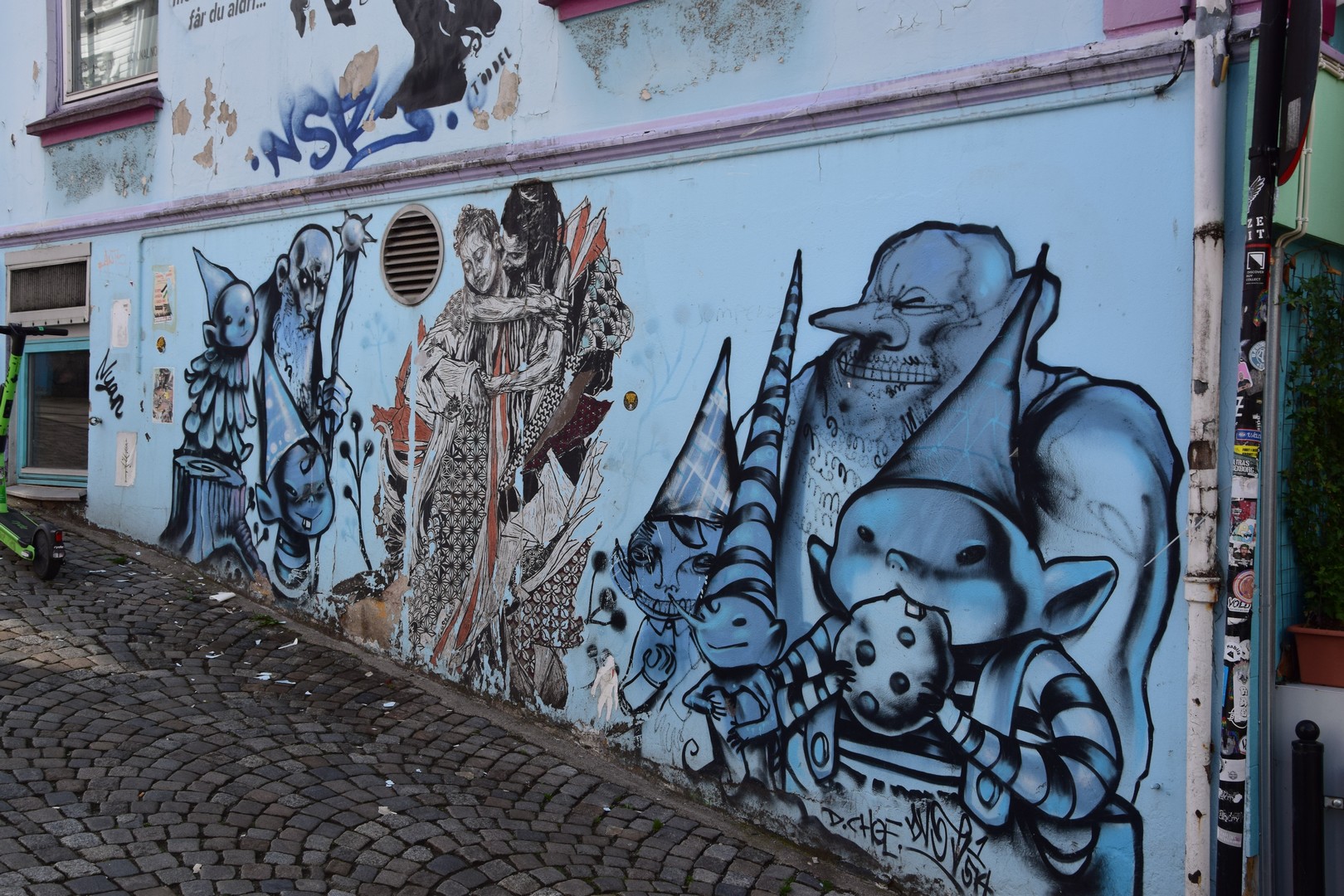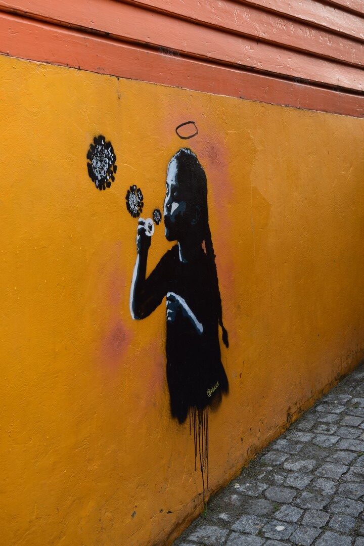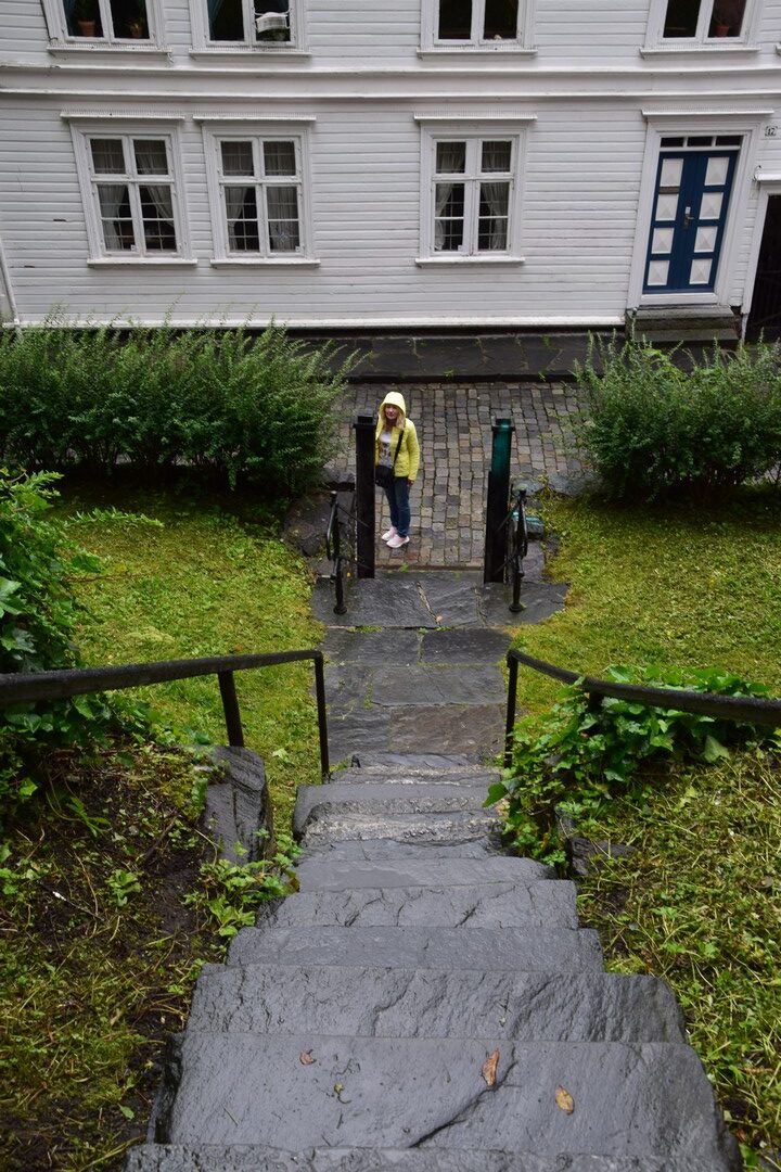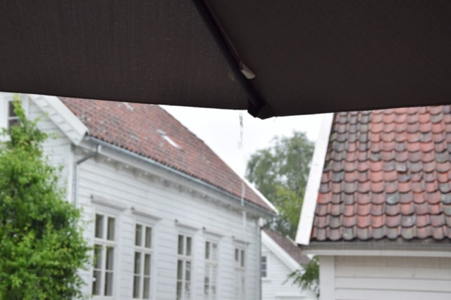I faktycznie – niedługo przestaje padać, ale zrobiło się chłodniej. Wracamy po kurtki i ponownie zanurzamy się w uliczki Gamle Stavanger. Niestety, znów dopada nas deszcz, więc chronimy się pod dużym parasolem przy galerii sztuki.