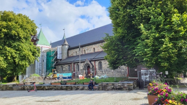 Katedra w Stavangerze (Stavanger domkyrkje) z 1150 roku to kolejny cel naszej wędrówki. Jest ona najstarszą norweską katedrą i została poświęcona patronowi miasta, świętemu Switunowi. Niestety, katedra otoczona płotem i informacją, że do końca 2023 roku trwa renowacja… Hmmm, mamy 2024, coś chyba poszło nie tak z aktualizacją tabliczki 😉