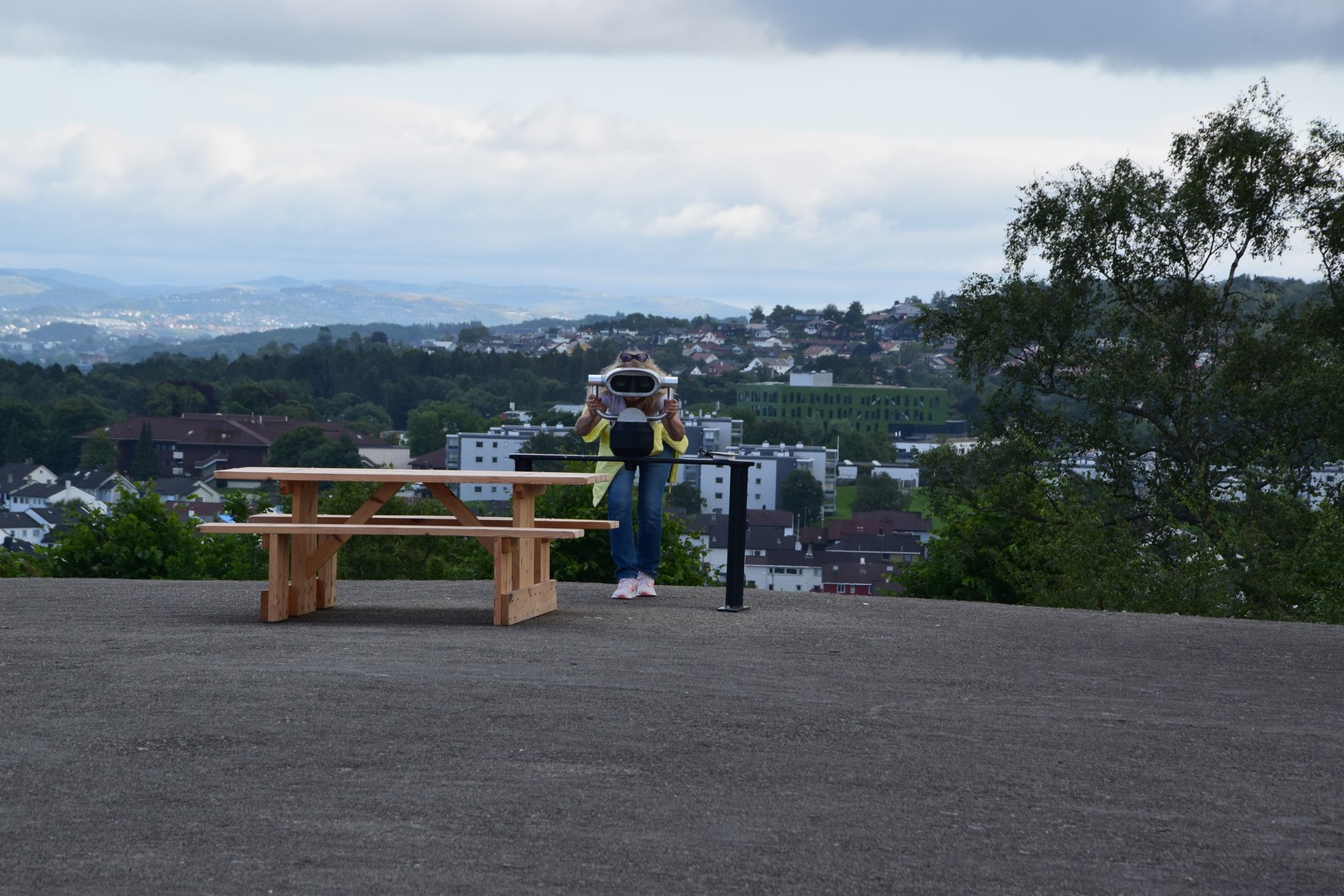 Spacerując docieramy do wieży Vålandstårnet z 1895 roku, położonej na wzgórzu z panoramą całego miasta. Na tarasie obok są lunety, ale drzewa mocno przysłaniają widok. Chyba były niższe, kiedy te lunety montowano 😉