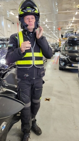 Do przystani promowej w Karlskronie dojeżdżamy około 20-tej – totalnie przemoczeni. Na szczęście motocykle zostają szybko załadowane na pokład. Marzymy o suchym ubraniu, więc lecimy do kabiny… i kolejna „niespodzianka”: serwis sprzątający jeszcze nie skończył, musimy poczekać 🙁